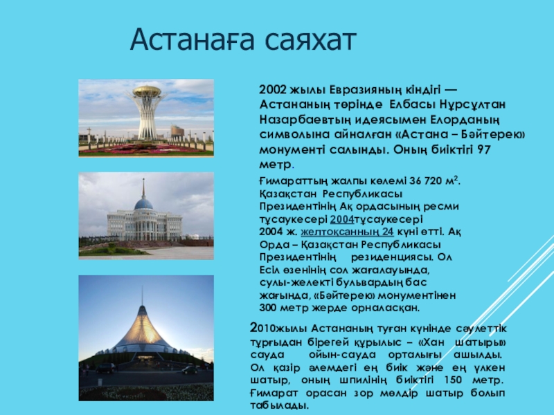 2010жылы Астананың туған күнінде сәулеттік тұрғыдан бірегей құрылыс – «Хан шатыры» сауда ойын-сауда орталығы ашылды. Ол қазір әлемдегі ең биік және ең үлкен шатыр, оның шпилінің биіктігі 150 метр. Ғимарат орасан зор мөлдір шатыр болып табылады.