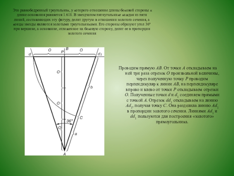 Это равнобедренный треугольник, у которого отношение длины боковой стороны к длине основания равняется 1.618. В звездчатом пятиугольнике каждая из пяти линий, составляющих эту фигуру, делит другую в отношении золотого сечения, а концы звезды являются золотыми треугольниками. Его стороны образуют угол 36° при вершине, а основание, отложенное на боковую сторону, делит ее в пропорции золотого сечения
