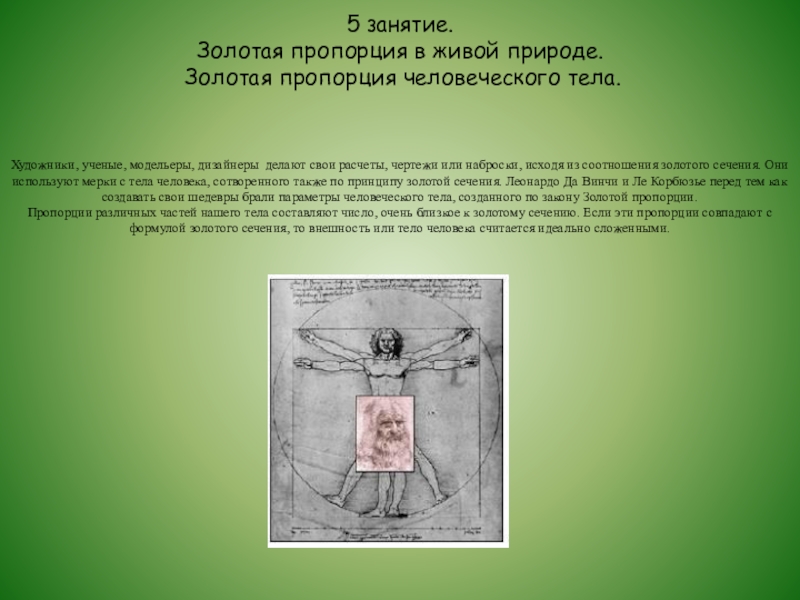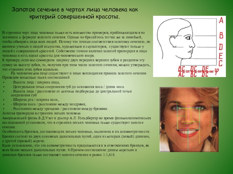 В биологических исследованиях было показано, что, начиная с вирусов и растений и кончая организмом человека, всюду выявляется золотая пропорция, характеризующая соразмерность и гармоничность их строения. Золотое сечение признано универсальным законом живых систем.