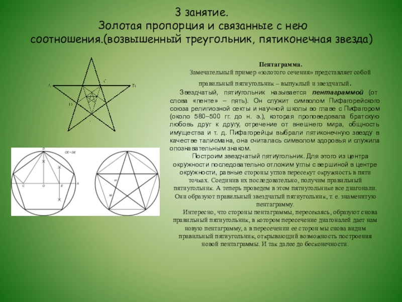 Построим звездчатый пятиугольник. Для этого из центра окружности последовательно отложим углы с вершиной в центре окружности, равные стороны углов пересекут окружность в пяти точках. Соединив их последовательно, получим правильный пятиугольник. А теперь проведем в этом пятиугольнике все диагонали. Они образуют правильный звездчатый пятиугольник, т. е. знаменитую пентаграмму.