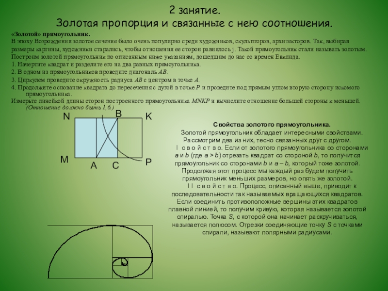 I I с в о й с т в о. Процесс, описанный выше, приводит к последовательности так называемых вращающихся квадратов. Если соединить противоположные вершины этих квадратов плавной линией, то получим кривую, которая называется золотой спиралью. Точка S, с которой она начинает раскручиваться, называется полюсом. Отрезки соединяющие точку S с точками спирали, называют полярными радиусами.