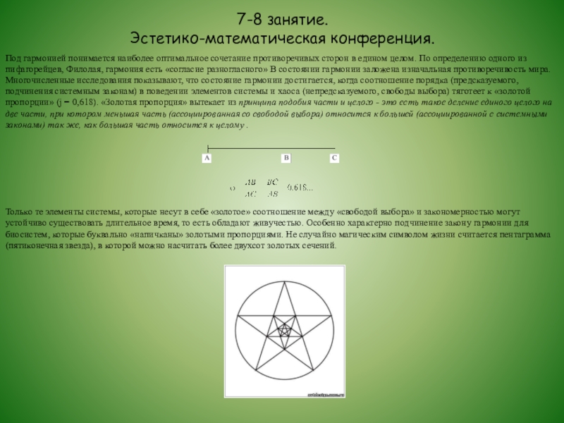 Только те элементы системы, которые несут в себе «золотое» соотношение между «свободой выбора» и закономерностью могут устойчиво существовать длительное время, то есть обладают живучестью. Особенно характерно подчинение закону гармонии для биосистем, которые буквально «напичканы» золотыми пропорциями. Не случайно магическим символом жизни считается пентаграмма (пятиконечная звезда), в которой можно насчитать более двухсот золотых сечений.