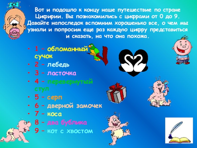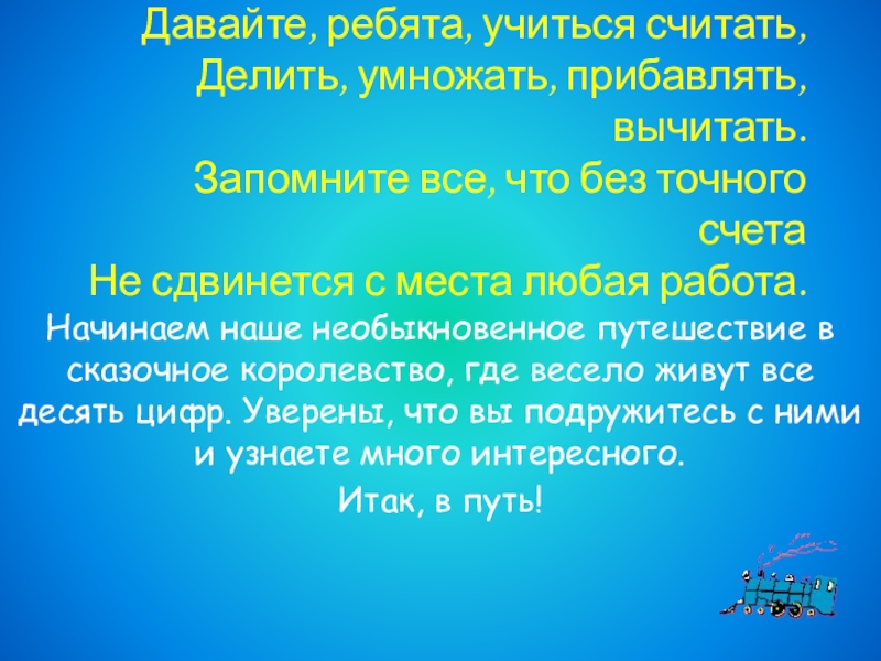 Начинаем наше необыкновенное путешествие в сказочное королевство, где весело живут все десять цифр. Уверены, что вы подружитесь с ними и узнаете много интересного.