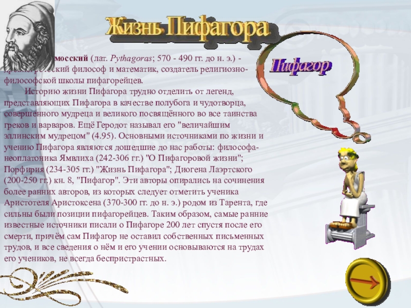 философ и математик, создатель религиозно-философской школы пифагорейцев.