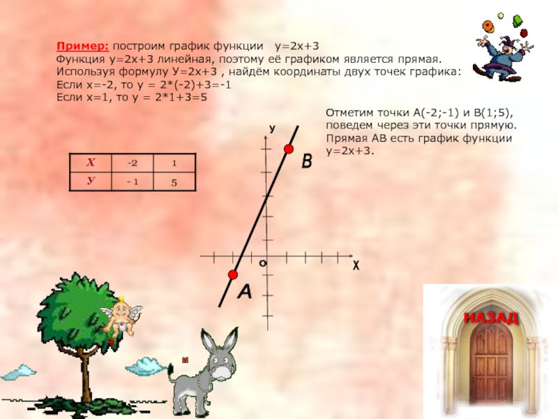 Отметим точки А(-2;-1) и В(1;5),поведем через эти точки прямую. Прямая АВ есть график функции у=2х+3.