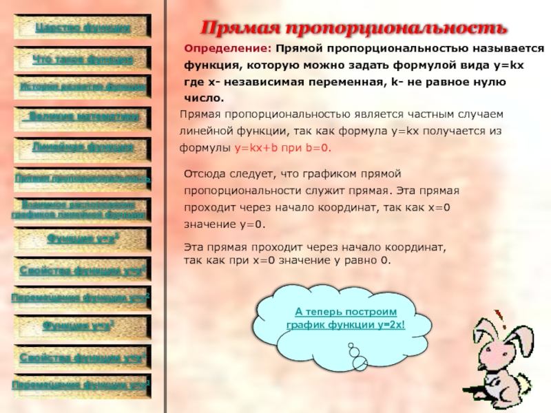 Отсюда следует, что графиком прямой пропорциональности служит прямая. Эта прямая проходит через начало координат, так как х=0 значение у=0.