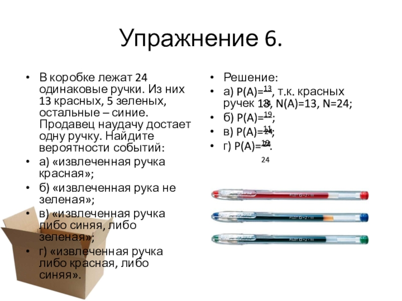 а) P(A)=13, т.к. красных ручек 13, N(A)=13, N=24;