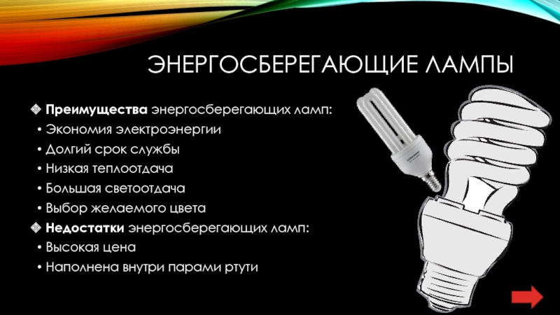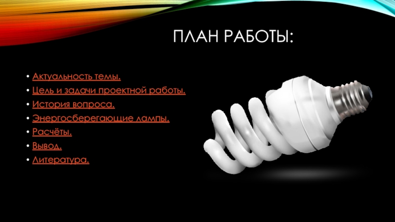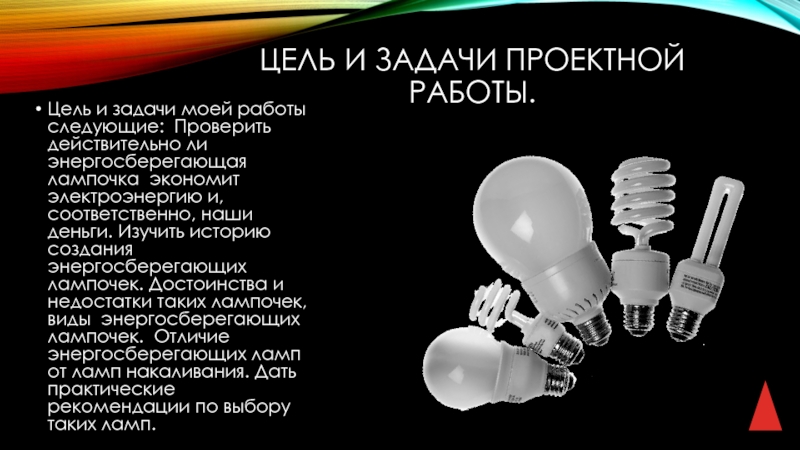 действительно ли энергосберегающая лампочка экономит электроэнергию и, соответственно, наши деньги. Изучить историю создания энергосберегающих лампочек. Достоинства и недостатки таких лампочек, виды энергосберегающих лампочек. Отличие энергосберегающих ламп от ламп накаливания. Дать практические рекомендации по выбору таких ламп.
