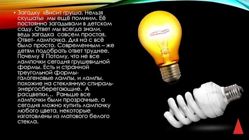 в детском саду. Ответ мы всегда знали, ведь загадка совсем простая. Ответ- лампочка. Для на с всё было просто. Современным – же детям подобрать ответ труднее. Почему ? Потому, что не все лампочки сегодня грушевидной формы. Есть и странной треугольной формы- галогеновые лампы, и лампы, похожие на стеклянную спираль- энергосберегающие. А расцветки… Раньше все лампочки были прозрачные, а сегодня можно купить лампочку любого цвета, некоторые изготовлены из матового белого стекла.