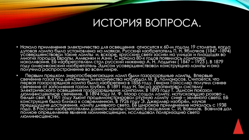 столетия, когда дуговая лампа была установлена на маяках. Русский изобретатель П. Н. Яблочков (1847 -1894) усовершенствовал такие лампы и, вскоре, «русский свет» засиял на улицах и площадях во многих городах Европы, Америки и Азии. С начала 80-х годов появилась лампочка накаливания. Её изобретателем стал русский инженер А. Н. Лодыгин ( 1847 – 1923 ). В 1879 году американский изобретатель Эдисон усовершенствовал конструкцию лампы и она получила распространение во всем мире.