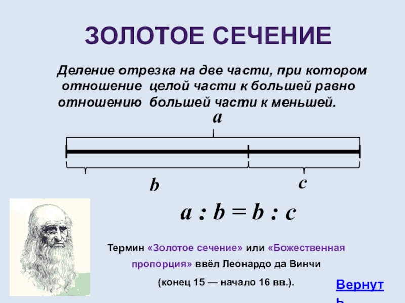 Термин «Золотое сечение» или «Божественная пропорция» ввёл Леонардо да Винчи