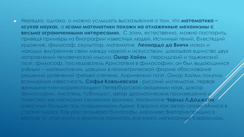 «сухая наука», а «сами математики похожи на отлаженные механизмы с весьма ограниченными интересами». С этим, естественно, можно поспорить, приведя примеры из биографии известных людей. Истинный гений, блестящий художник, философ, скульптор, математик Леонардо да Винчи искал и находил внутренние связи между наукой и искусством, доказывая единство двух направлений человеческой мысли. Омар Хайям - персидский и таджикский поэт, философ, последователь Аристотеля в философии, он был выдающимся учёным – математиком, давшим в геометрической форме обоснования решений уравнений третьей степени. Лирический поэт, Омар Хайям получил всемирную известность. Софья Ковалевская - русский математик, первая женщина-член-корреспондент Петербургской академии наук, доктор философии, писатель, публицист, автор драматических произведений и повестей, ею написана семейная хроника. Математик Чарльз Л.Доджсон, известный больше под псевдонимом Льюис Кэрролл как автор сказки «Алиса в стране чудес». Как рассказывают биографы, королева Виктория пришла в восторг от этой книги и захотела прочитать все книги, написанные Кэрроллом.