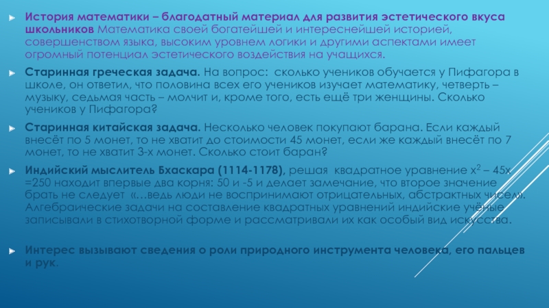 Слайд 8История математики – благодатный материал для развития эстетического вкуса школьников Математика
