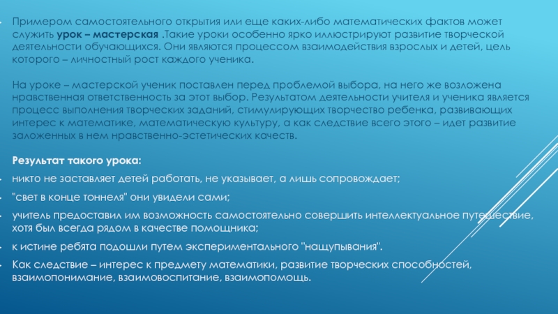 На уроке – мастерской ученик поставлен перед проблемой выбора, на него же возложена нравственная ответственность за этот выбор. Результатом деятельности учителя и ученика является процесс выполнения творческих заданий, стимулирующих творчество ребенка, развивающих интерес к математике, математическую культуру, а как следствие всего этого – идет развитие заложенных в нем нравственно-эстетических качеств.