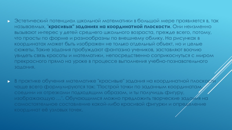 В практике обучения математике "красивые" задания на координатной плоскости чаще всего формулируются так: "Построй точки по заданным координатам, соедини их отрезками подходящим образом, и ты получишь фигуру, изображающую …". Обучающимся можно предложить творческие задания на самостоятельное составление какой-либо красивой фигурки и определение координат её узловых точек.