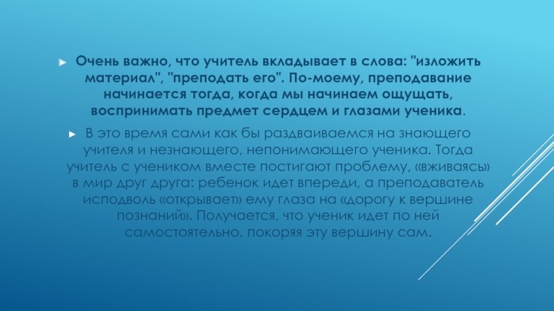 Слайд 6Очень важно, что учитель вкладывает в слова: "изложить материал", "преподать его".