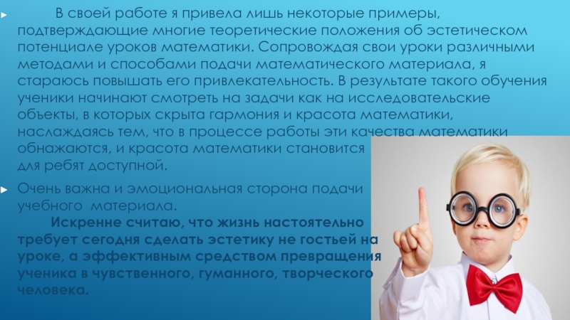 теоретические положения об эстетическом потенциале уроков математики. Сопровождая свои уроки различными методами и способами подачи математического материала, я стараюсь повышать его привлекательность. В результате такого обучения ученики начинают смотреть на задачи как на исследовательские объекты, в которых скрыта гармония и красота математики, наслаждаясь тем, что в процессе работы эти качества математики обнажаются, и красота математики становится для ребят доступной.