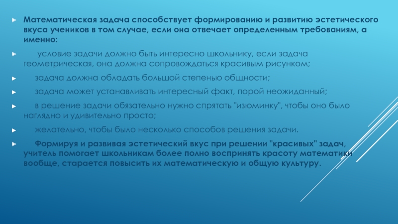 Слайд 12Математическая задача способствует формированию и развитию эстетического вкуса учеников в том