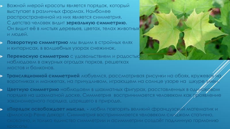 «Порядок освобождает мысль», - любил повторять великий французский математик и философ Рене Декарт. Симметрия воспринимается человеком слишком статично, скованно, и только единство симметрии и асимметрии создаёт подлинную гармонию красоты.