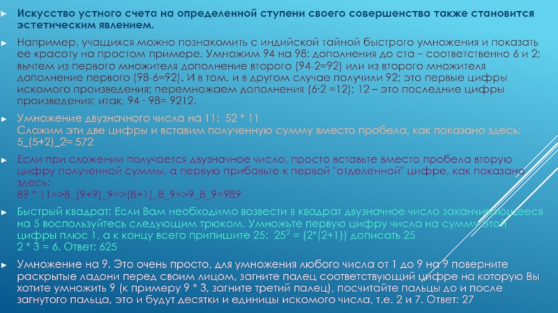 Слайд 13Искусство устного счета на определенной ступени своего совершенства также становится эстетическим
