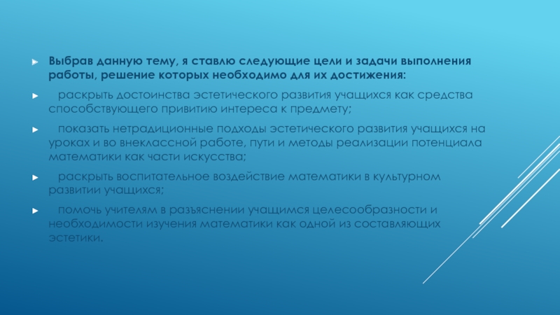 показать нетрадиционные подходы эстетического развития учащихся на уроках и во внеклассной работе, пути и методы реализации потенциала математики как части искусства;