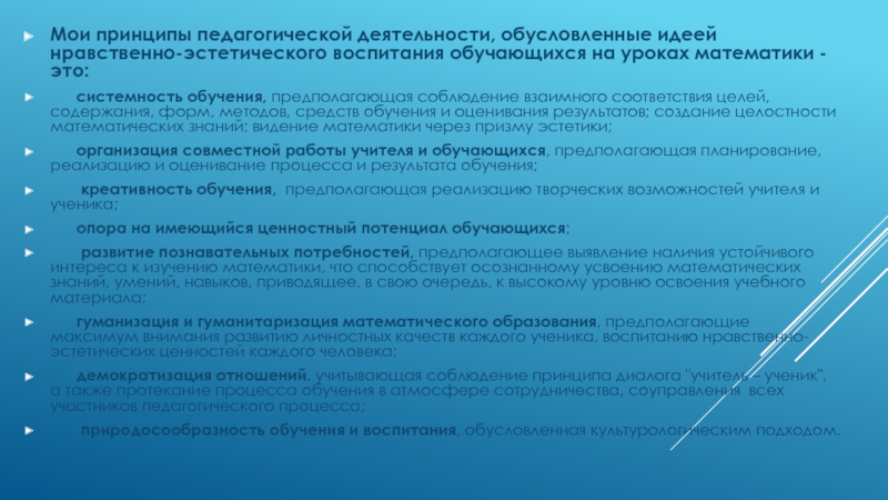 Слайд 7Мои принципы педагогической деятельности, обусловленные идеей нравственно-эстетического воспитания обучающихся на уроках