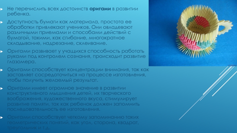 Оригами способствует четкому запоминанию таких геометрических понятий, как угол, сторона, квадрат, треугольник и т.д.