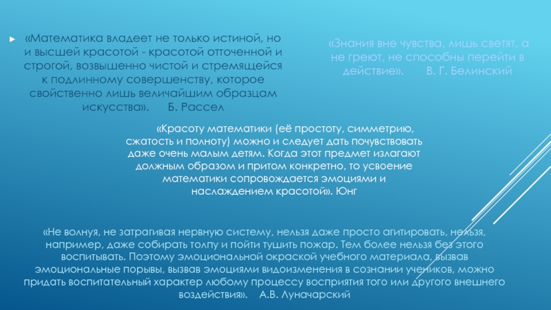 «Красоту математики (её простоту, симметрию, сжатость и полноту) можно и следует дать почувствовать даже очень малым детям. Когда этот предмет излагают должным образом и притом конкретно, то усвоение математики сопровождается эмоциями и наслаждением красотой». Юнг