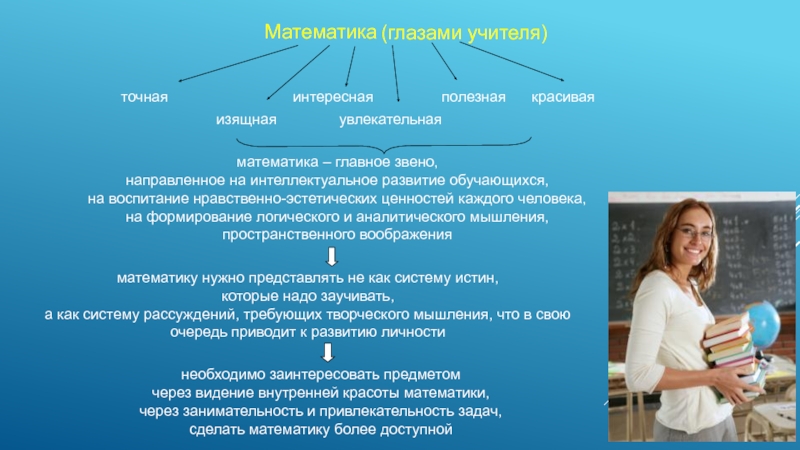 гуманизация и гуманитаризация математического образования, предполагающие максимум внимания развитию личностных качеств каждого ученика, воспитанию нравственно-эстетических ценностей каждого человека;