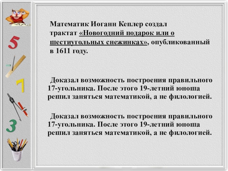 Доказал возможность построения правильного 17-угольника. После этого 19-летний юноша решил заняться математикой, а не филологией.