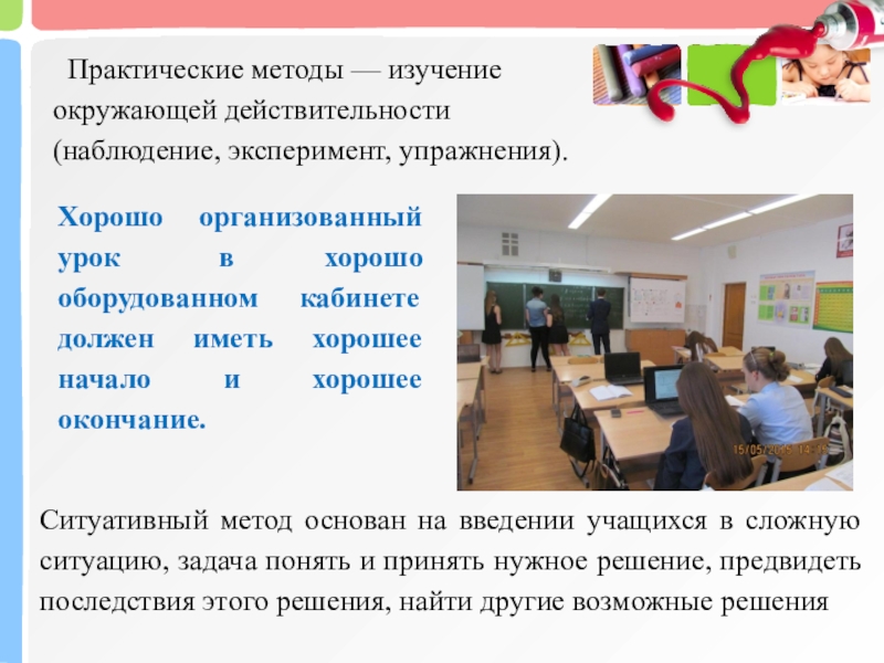 Практические методы — изучение окружающей действительности (наблюдение, эксперимент, упражнения).