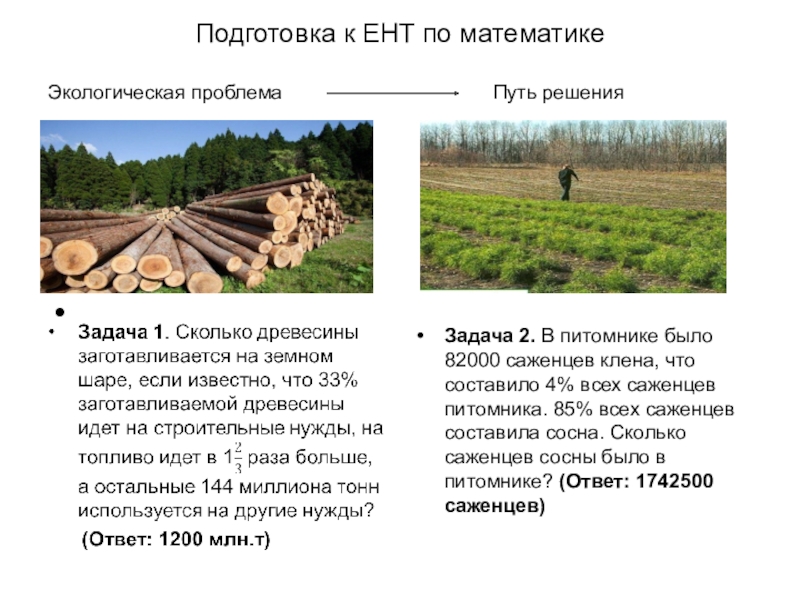 Задача 2. В питомнике было 82000 саженцев клена, что составило 4% всех саженцев питомника. 85% всех саженцев составила сосна. Сколько саженцев сосны было в питомнике? (Ответ: 1742500 саженцев)