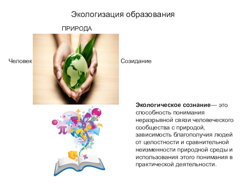 Экологическое сознание— это способность понимания неразрывной связи человеческого сообщества с природой, зависимость благополучия людей от целостности и сравнительной неизменности природной среды и использования этого понимания в практической деятельности.