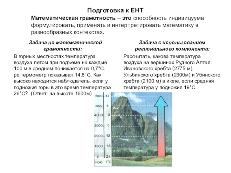 Рассчитать, какова температура воздуха на вершинах Рудного Алтая: Ивановского хребта (2775 м), Ульбинского хребта (2300м) и Убинского хребта (2100 м) в июле, если средняя температура у подножия 19°С.