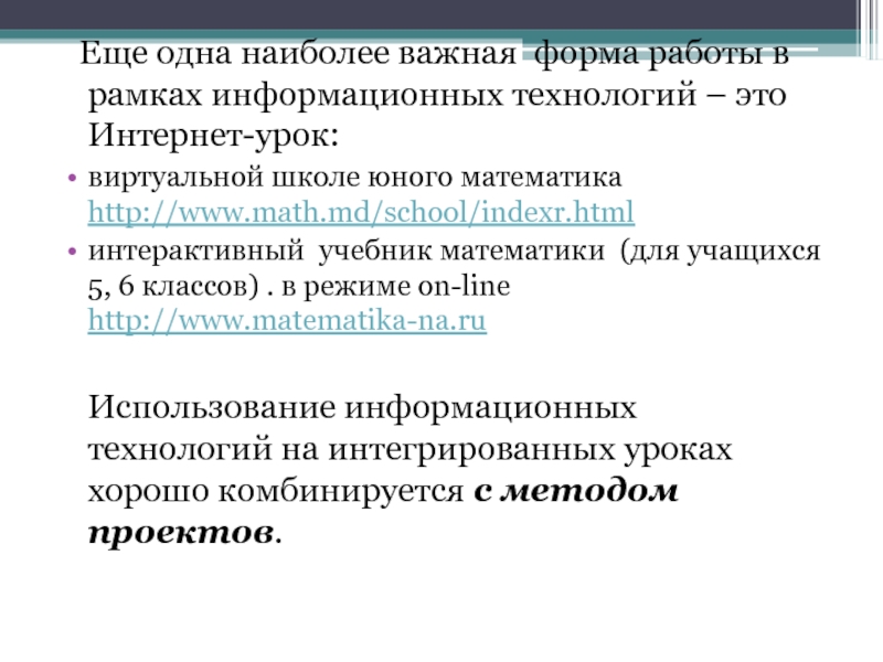 Использование информационных технологий на интегрированных уроках хорошо комбинируется с методом проектов.