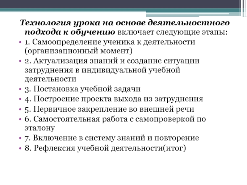 Слайд 15 Технология урока на основе деятельностного подхода к обучению включает следующие