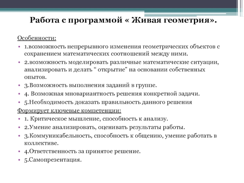 2.возможность моделировать различные математические ситуации, анализировать и делать “ открытие” на основании собственных опытов.