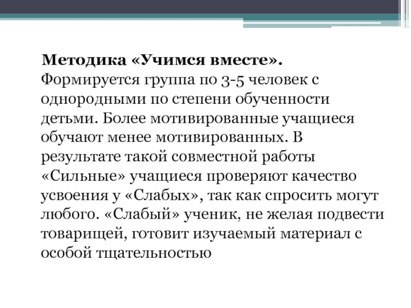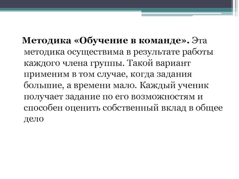 Слайд 12 Методика «Обучение в команде». Эта методика осуществима в результате работы