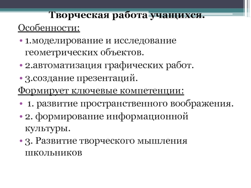 Это можно добиться за счет увеличения доли самостоятельных работ творческого и поискового, исследовательского и экспериментального характера.