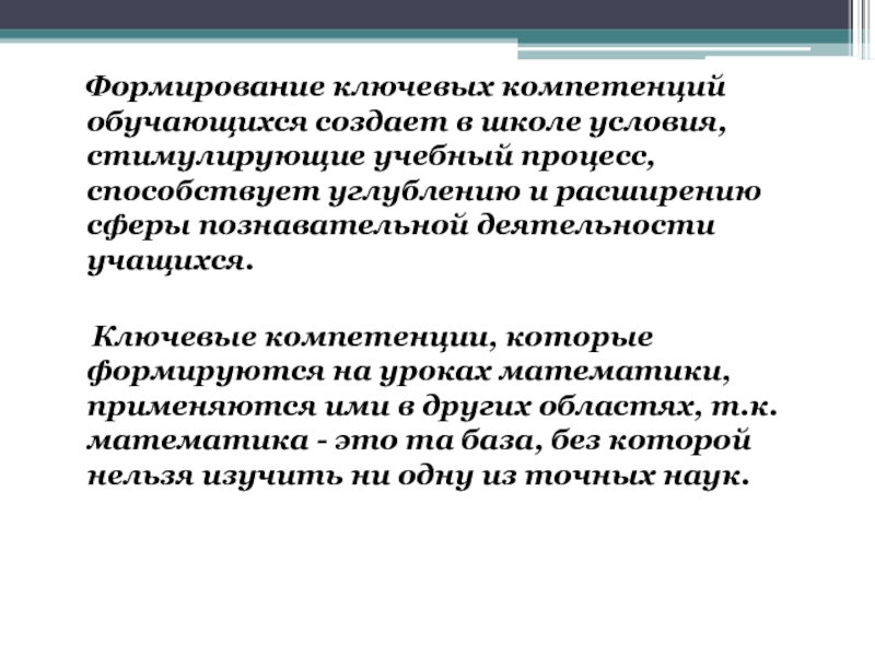 Ключевые компетенции, которые формируются на уроках математики, применяются ими в других областях, т.к. математика - это та база, без которой нельзя изучить ни одну из точных наук.