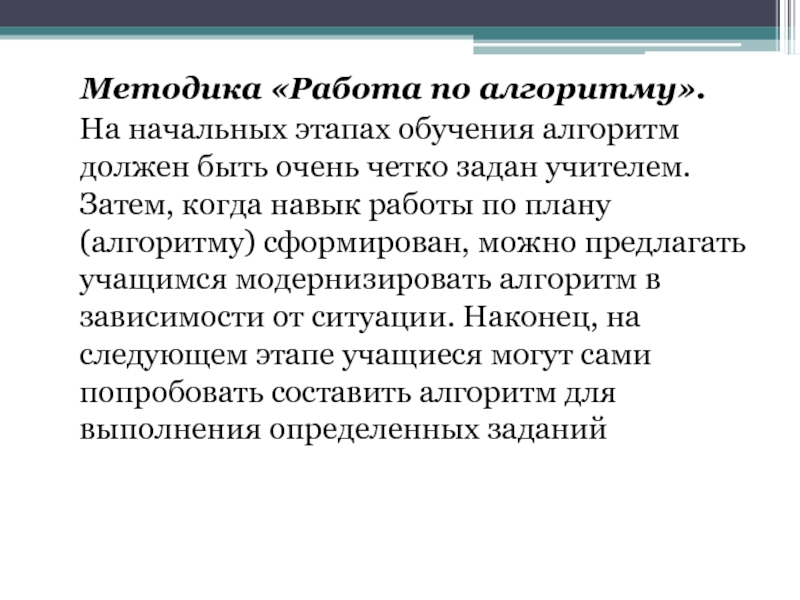 этапах обучения алгоритм должен быть очень четко задан учителем. Затем, когда навык работы по плану (алгоритму) сформирован, можно предлагать учащимся модернизировать алгоритм в зависимости от ситуации. Наконец, на следующем этапе учащиеся могут сами попробовать составить алгоритм для выполнения определенных заданий