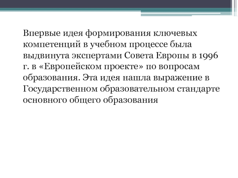 выдвинута экспертами Совета Европы в 1996 г. в «Европейском проекте» по вопросам образования. Эта идея нашла выражение в Государственном образовательном стандарте основного общего образования