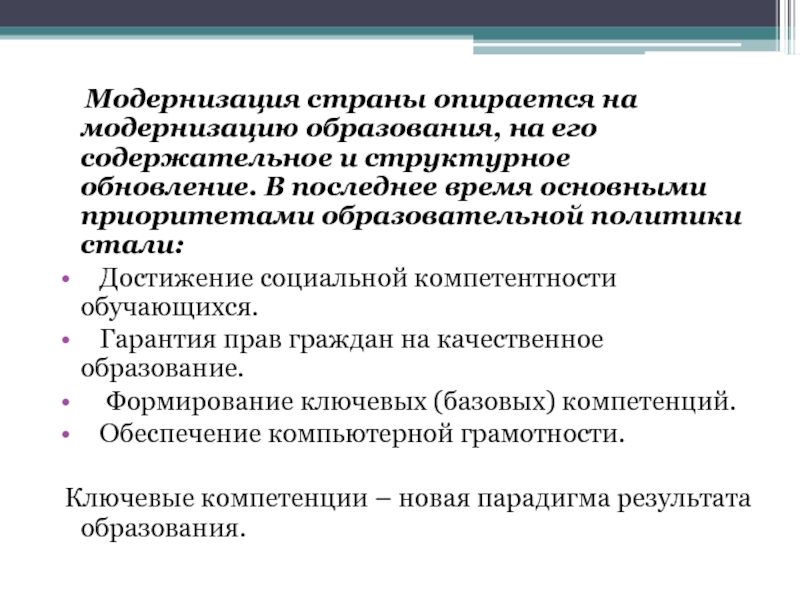 его содержательное и структурное обновление. В последнее время основными приоритетами образовательной политики стали: