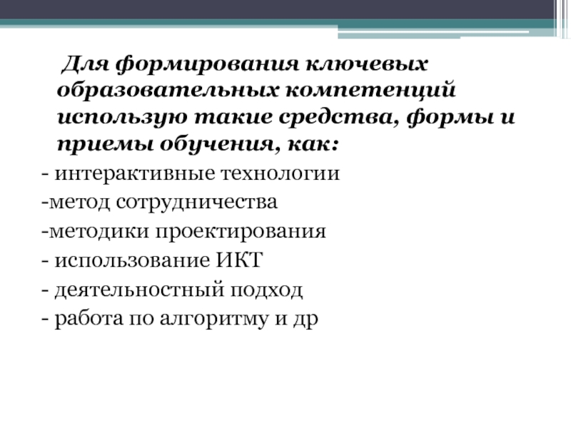 Для формирования ключевых образовательных компетенций использую такие средства, формы