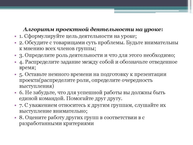 Слайд 14 Алгоритм проектной деятельности на уроке:
