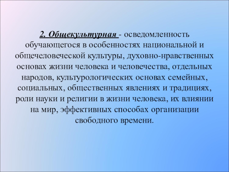Слайд 72. Общекультурная - осведомленность обучающегося в особенностях национальной и общечеловеческой культуры,