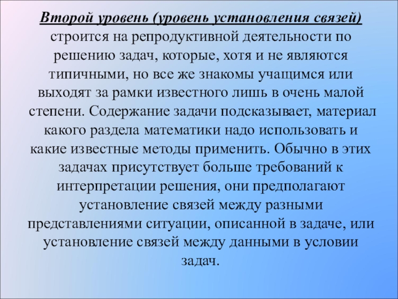 Слайд 23Второй уровень (уровень установления связей) строится на репродуктивной деятельности по решению