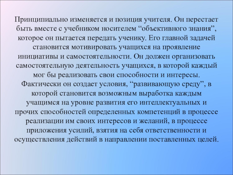 носителем “объективного знания”, которое он пытается передать ученику. Его главной задачей становится мотивировать учащихся на проявление инициативы и самостоятельности. Он должен организовать самостоятельную деятельность учащихся, в которой каждый мог бы реализовать свои способности и интересы. Фактически он создает условия, “развивающую среду”, в которой становится возможным выработка каждым учащимся на уровне развития его интеллектуальных и прочих способностей определенных компетенций в процессе реализации им своих интересов и желаний, в процессе приложения усилий, взятия на себя ответственности и осуществления действий в направлении поставленных целей.