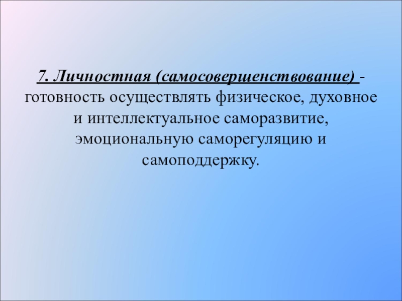 Слайд 127. Личностная (самосовершенствование) - готовность осуществлять физическое, духовное и интеллектуальное саморазвитие,