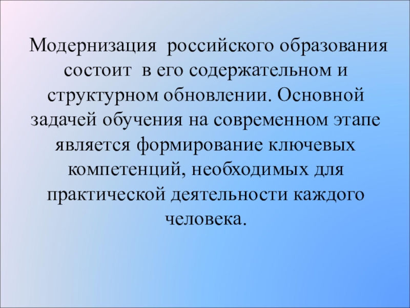 Слайд 2Модернизация российского образования состоит в его содержательном и структурном обновлении. Основной